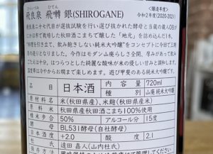 「銀(SIROGANE)」は、地元にかほ市産酒こまち50%精米、酸度2,1、日本酒度+2,0、アルコール15度、酵母はBL531(二十七代目作の自社酵母)です。