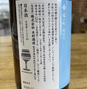 秋田県産美山錦55%精米、産土1,4、アミノ酸1,2、日本酒度+2,0、アルコール16,5度原酒、酵母は協会1801号酵母です。