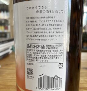 地元矢島町、天寿酒米研究会産秋田酒こまち55%精米、酸度1,4、アミノ酸1,1、日本酒度±0、アルコール15度原酒、酵母は自社培養ND-4(東京農大花酵母)です。