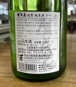 原料米は広島山田錦100%使用で、麹60%、掛70%、酸度1,8、日本酒度ー3、アルコール15度、酵母は熊本酵母のKA-1です。