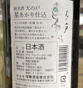 東成瀬村祝い側地区で契約栽培された星あかり77%精米、酸度2,3、アミノ酸1,0、日本酒度+3,3、アルコール16,6度原酒、酵母は協会701号酵母です。