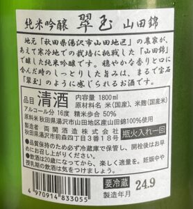 地元湯沢市の山田地区の篤農家さんが栽培した山田錦100%使用し50%精米、酸度1,5、アミノ酸0,7、日本酒度+0,6、アルコール16度原酒、酵母は非公開です。