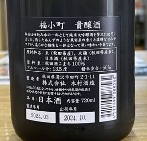 秋田酒こまち55%精米、酸度2,0、日本酒度-37、アルコール13,5度、酵母は秋田酵母No,12です。