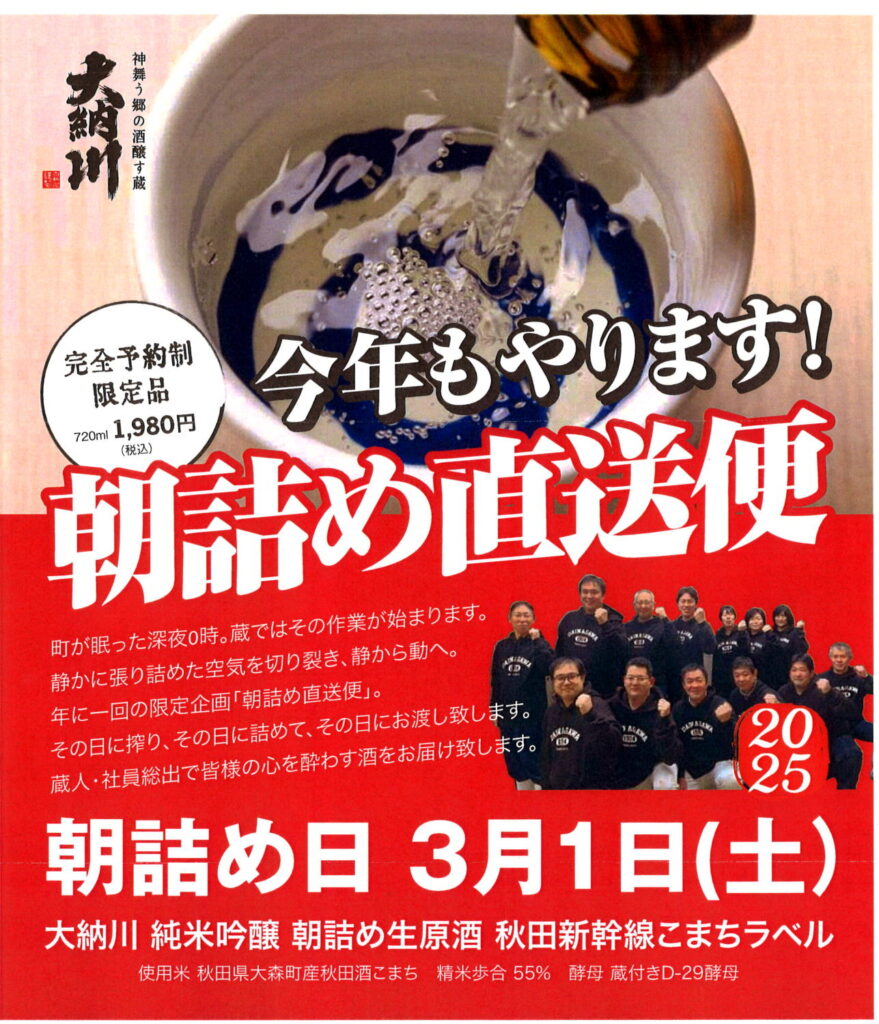 3年目となる大好評企画「大納川 純米吟醸 朝詰め直送便(無濾過生原酒)」が今年も3月1日(土)に発売となります!