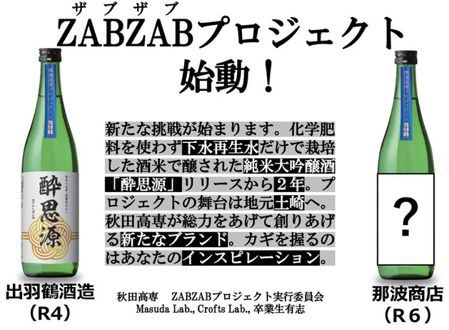 ZABZAB(ザブザブ)は、水と資源の循環に配慮して作られたお米で醸したお酒です。この名前は、田んぼに水と栄養が「ザブザブ」と注がれていく情景と、Z→A→B・・・Z→A→B・・・と資源が循環し続いていくイメージをアルファベットで表現しています。青い空、白い雲、田んぼの中には汗を流して環境問題に取り組む高専生、そんな情景を思い浮かべながら、このお酒を楽しんでいただければと思います。