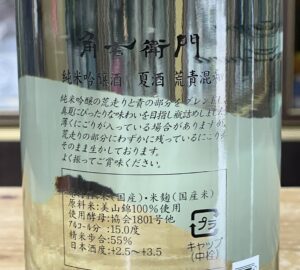 原料米は美山錦55%精米、酸度1,4、アミノ酸1,1、日本酒度+3,5、アルコール15,0度、酵母は協会1801号です。