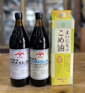 大人気、国産こめ油とヤマアの国産大豆使用の無添加醤油。