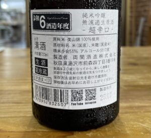 秋田県産美山錦55%精米、酸度1,8、アミノ酸0,9、日本酒度+13,0、アルコール17度原酒、酵母は非開示です。