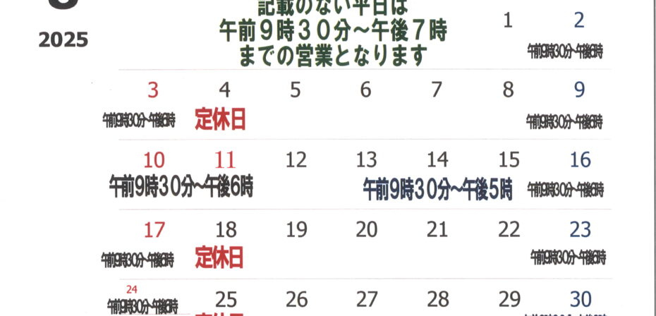・土日・祝日は午前9時30分~午後6時の営業となります。