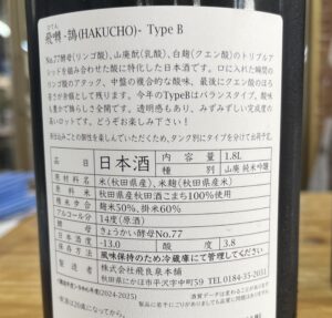 秋田酒こまちを使用し麹米50%精米、掛け米60%精米、酸度3,8、日本酒度-13,0、アルコール14度台原酒、山廃仕込みで酵母はきょうかい酵母No.77です。