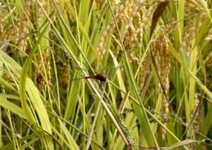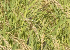 背景にゴミかチリのように写り込んでいるのは、アキアカネ(赤とんぼ)です。