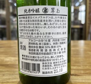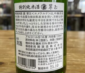 秋田県産米を使用し50%精米、酸度1,5、アミノ酸1,0、日本酒度+3,5、アルコール16度台原酒、酵母は非公開で1回火入れです。