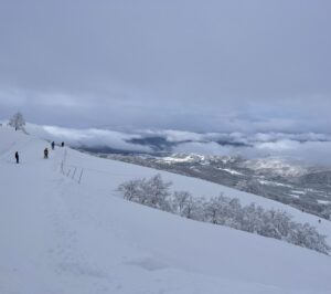 標高の低い黒森ゲレンデはベタ雪のことが多いのですが、非圧雪の急斜面が膝までくぐりながらも気持ちよくスプレーをあげることができました。