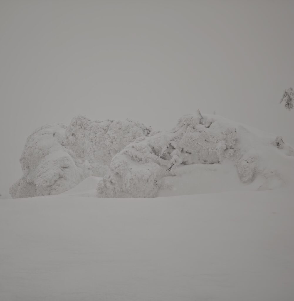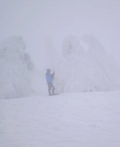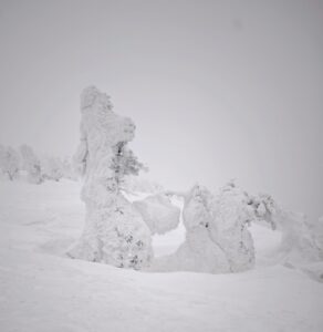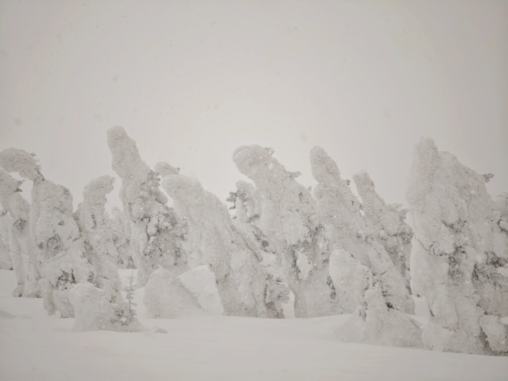 樹氷も小さくなり、石森までのトラバース地点に来ると、雪も降ってきてますます視界が悪くなったので、これ以上上を目指すのは断念。