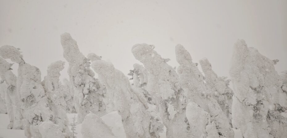 杉帯・白樺帯・ブナ帯(ゴンドラ終着駅)の上が樹氷のあるオオシラビソ(アオモリトドマツ)帯となるのですが、だいぶ霞んでいます。(T-T)