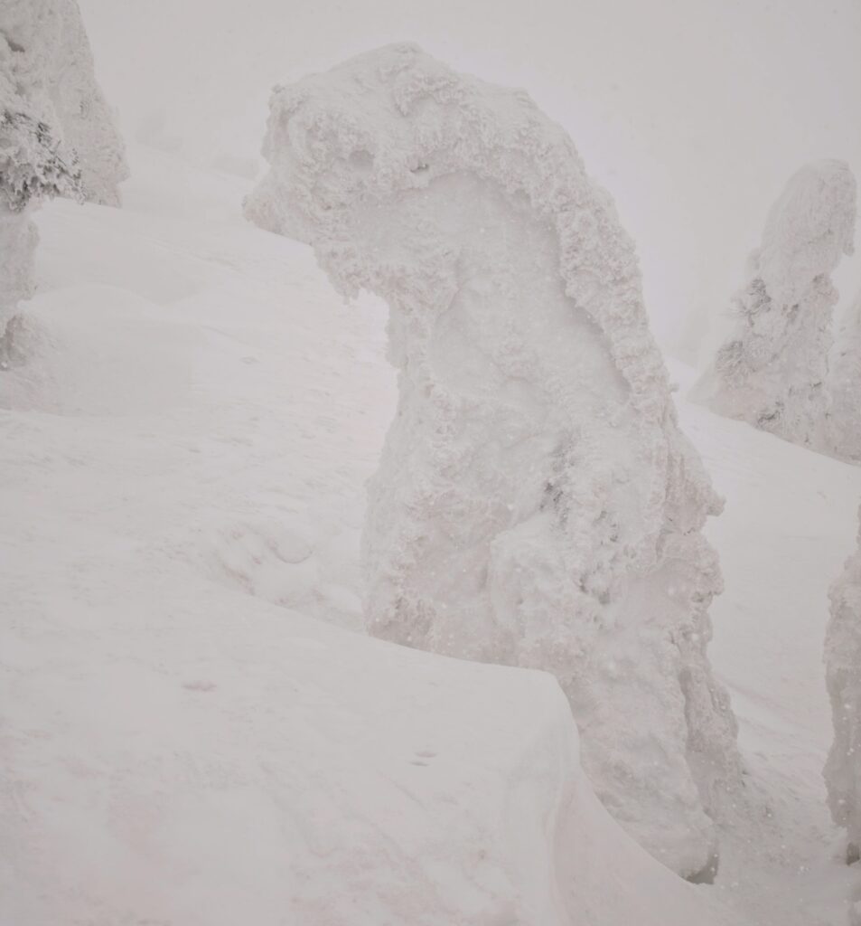 観光客も歩いてこれる樹氷帯からコース外にでても、溶け落ちた感じがあります。