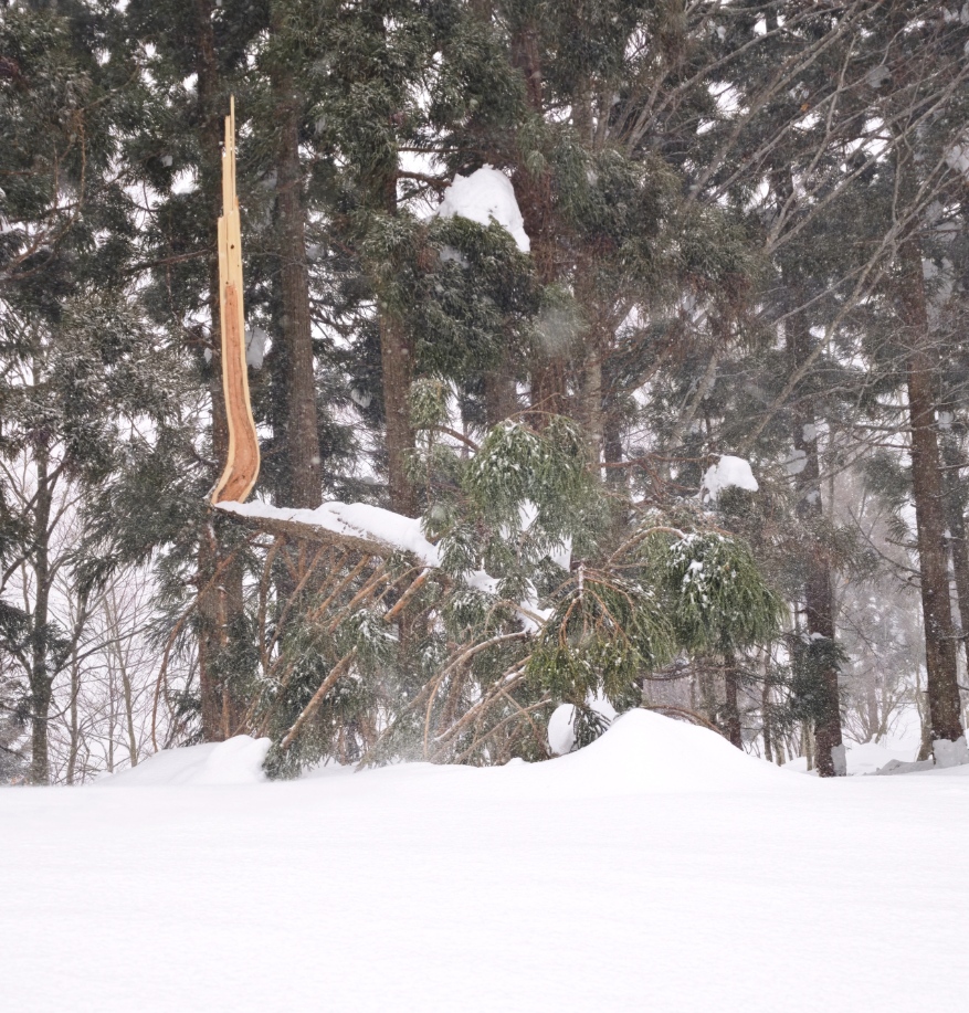 視界の効かないガリガリ斜面を滑り降りて杉帯まで来ると、あちこちで雪の重みで折れた木が散見されます。