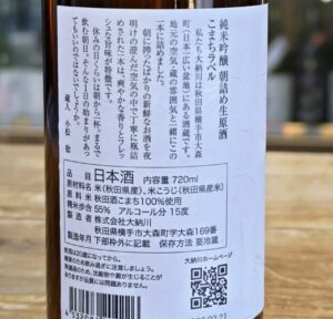 秋田酒こまち55%精米、酸度1,6、アミノ酸0,9、日本酒度-3、アルコール15度原酒、酵母は蔵付き分離酵母のD-29酵母です。(スペック値は予定値です)