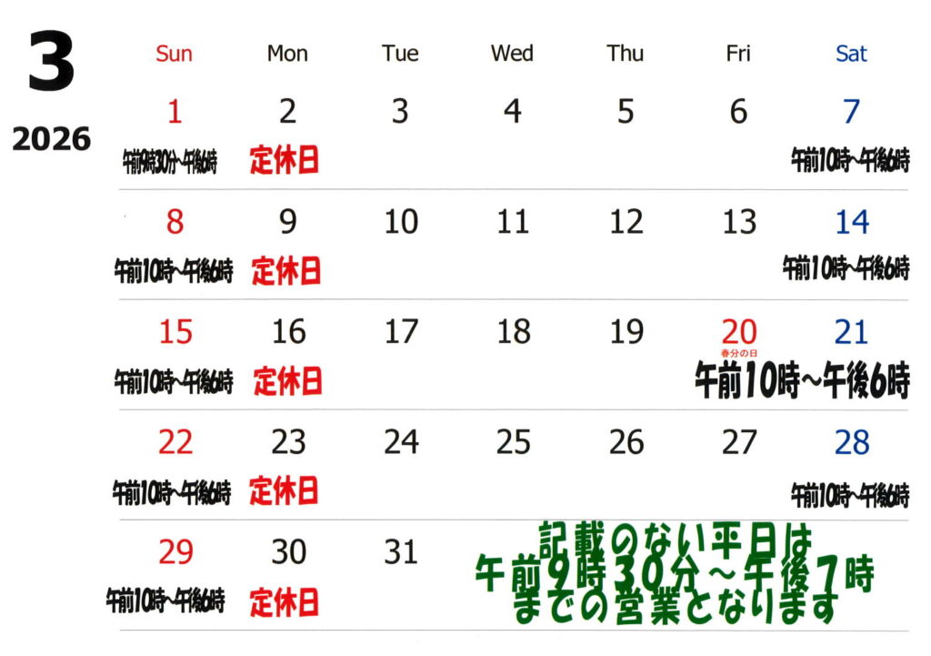 この3月7日(土)からは、土日祝日の開店を午前10時とさせていただきます。