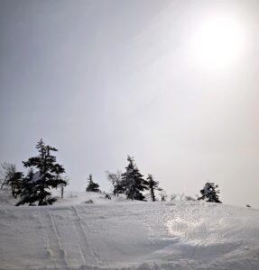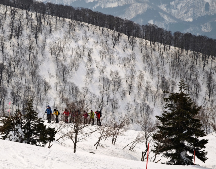 山頂に向かうスノーシューハイクのツアーが出発したところ。