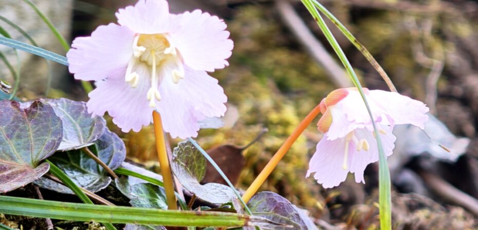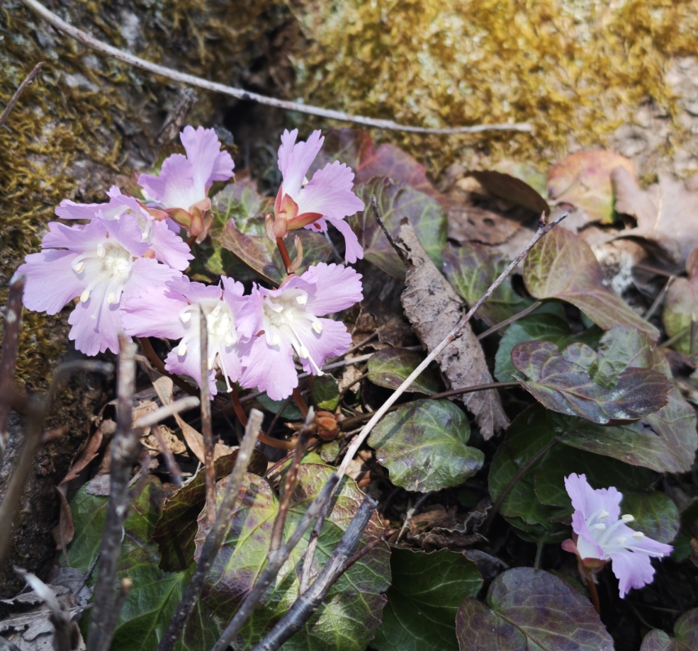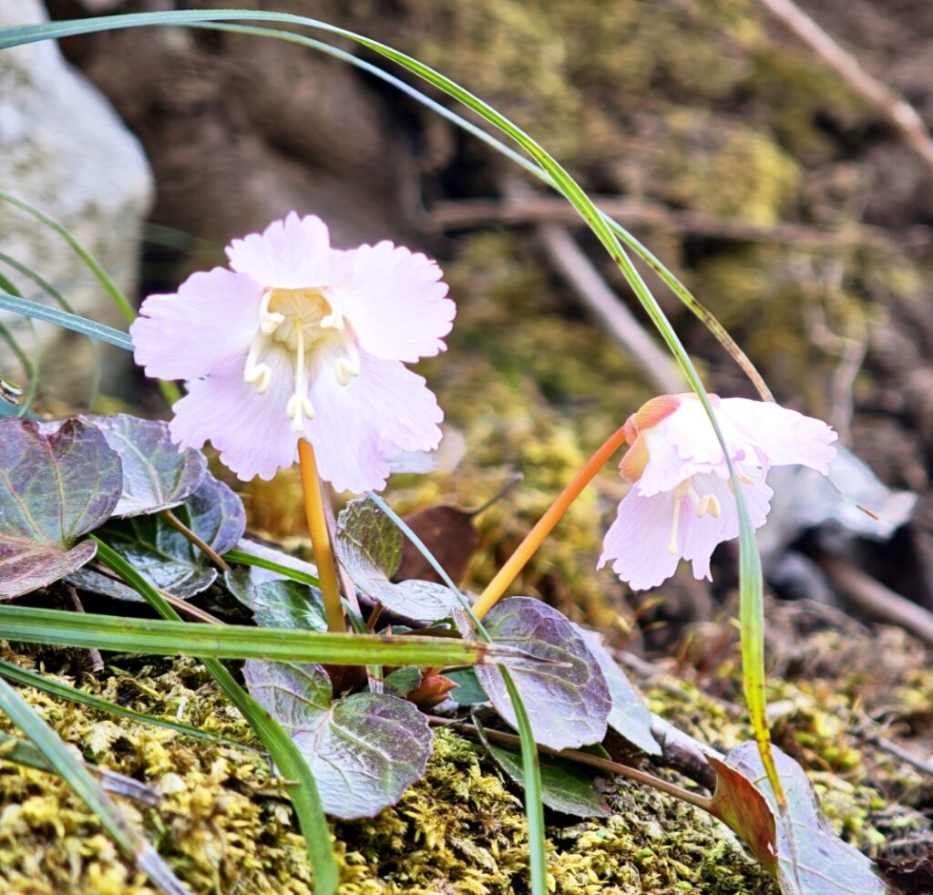 雪解け水が濡らす斜面にショウジョウバカマ。