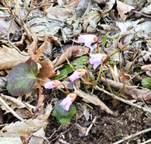 スギ花粉舞い散って、黄色く霞むスギ林を抜けてピーク252(エボシ山)を巻き道から直登すると、ポチッとイワウチワのつぼみが!