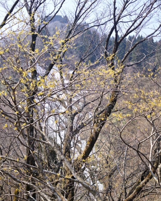 マンサクの花越しに姫神山山頂を望む