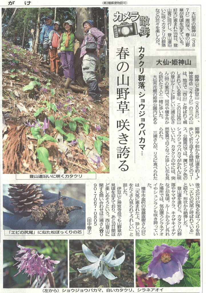 22日(日)朝、私は単独で神宮寺嶽にイワウチワを見に行きましたが、娘はその時、私の山の師匠の三浦さんに誘われ、秋田魁新報の田中倫子記者と西山・姫神山に行っていました。