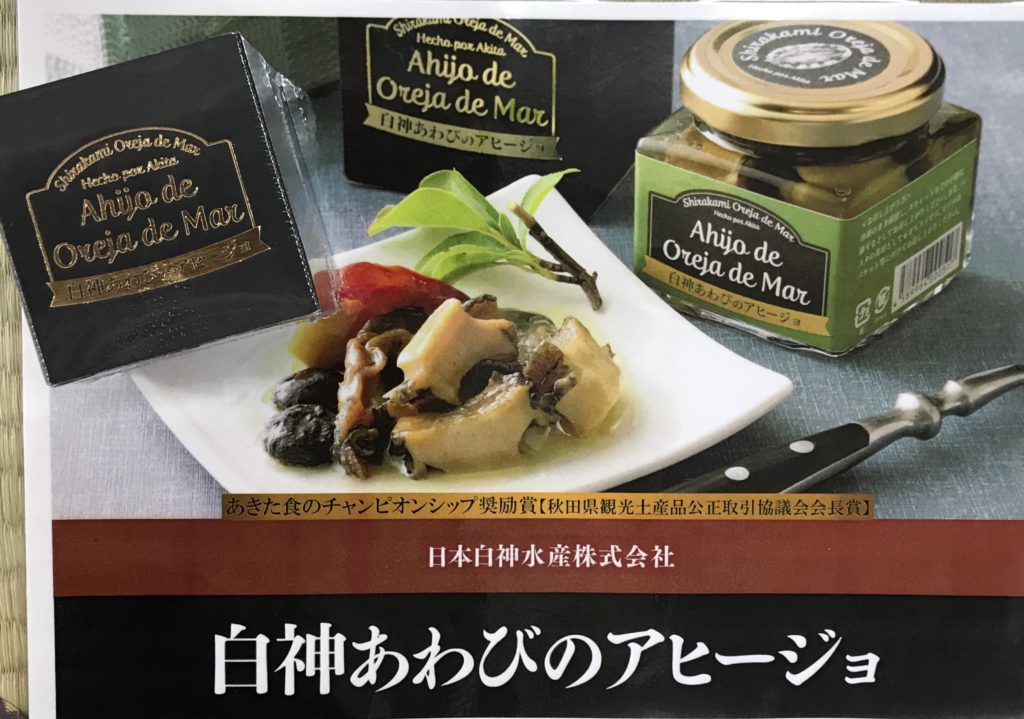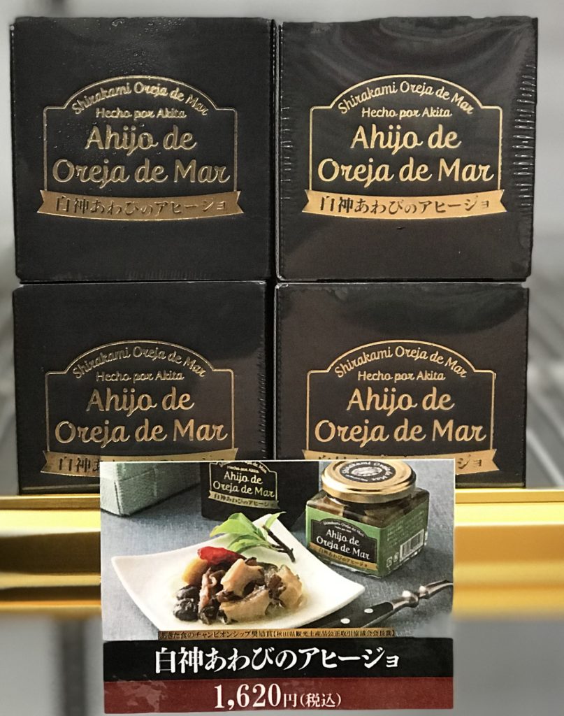 こちらは「白瀑」のある秋田県八峰町で、廃校となった小学校を利用して、海から海水をくみ上げてかつての教室にプールを作ってアワビを養殖している「日本白神水産」さんの「白神アワビのアヒージョ」を取り扱うことになりました。